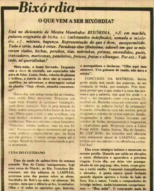 O "Lampião da Esquina" foi o primeiro jornal alternativo gay do Brasil. Fundada em 1978, a publicação - que circulou durante três anos - teve o autor de novelas e jornalista Aguinaldo Silva e o escritor João Silvério Trevisan, entre outros comunicadores homossexuais, como os principais formadores de opinião. A coluna BIXÓRDIA apareceu na edição número 05 do jornal.