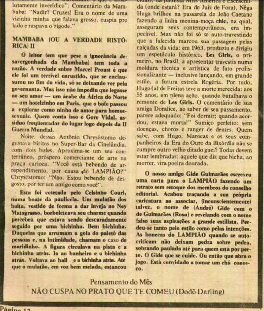 dizer que Proust e Wilde se travestiam, o que é absolutamente inverídico". Comentário da Mambaba: "Nadir? Cruzes! Era o nome de uma vizinha minha que